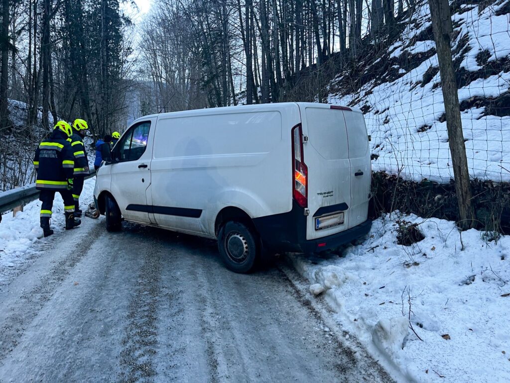 Ein Kleintransporter kam auf der eisigen Straße nichtmehr weiter, und rutschte Rückwärts gegen einen Hang.