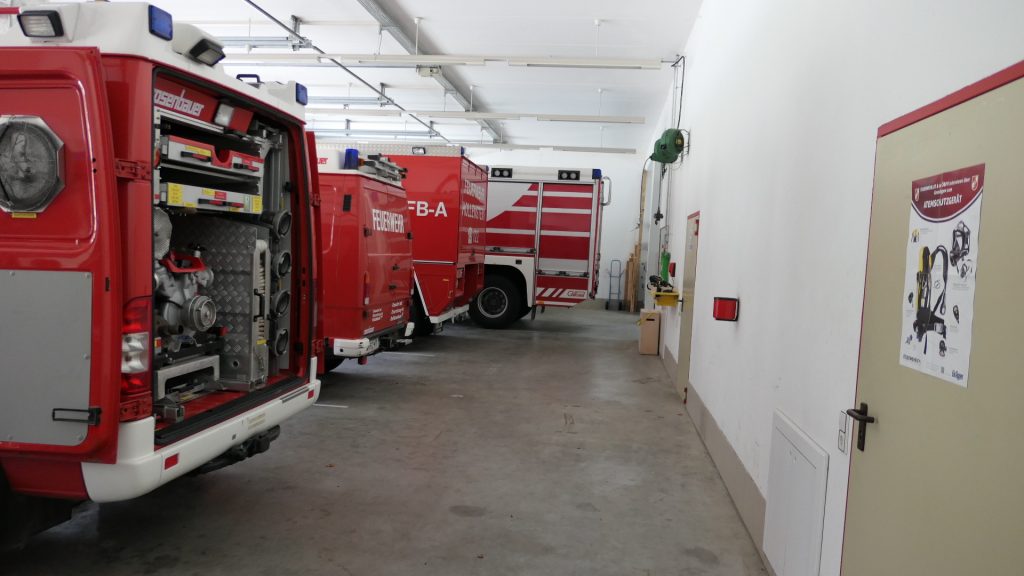 Im Erdgeschoß befindet sich die Fahrzeughalle, Werkstatt, Umkleideraum, Heizraum, Zugang Schlauchturm, Dusche, 2 WCs, Aufenthaltsraum und Küche sowie die Einsatzleitzentrale.